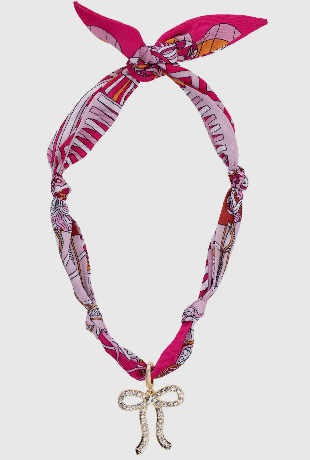 Elevate your style with the Cassie Bow Scarf Necklace. Bright fuchsia and orange shades combined with a glitter bow charm make this scarf necklace a statement piece. Add a pop of color and sparkle to any outfit!