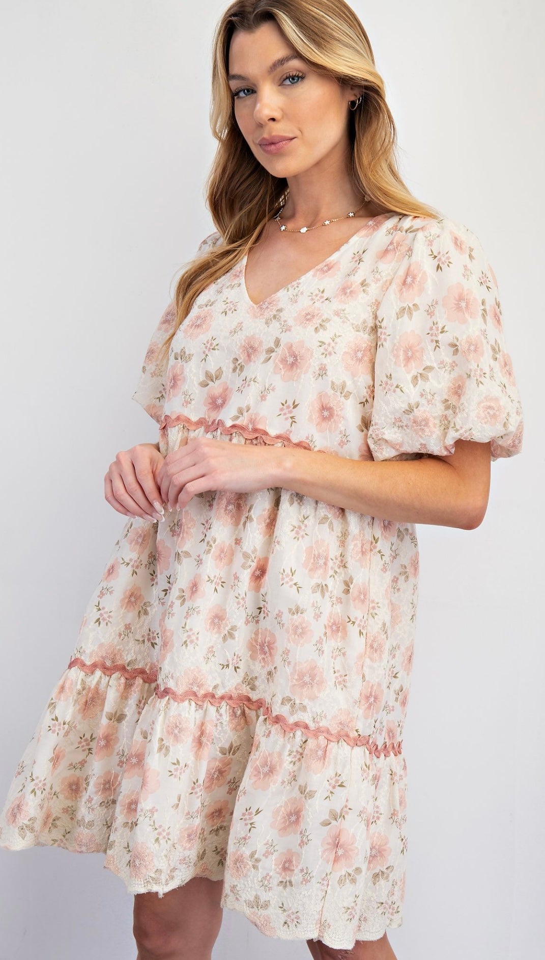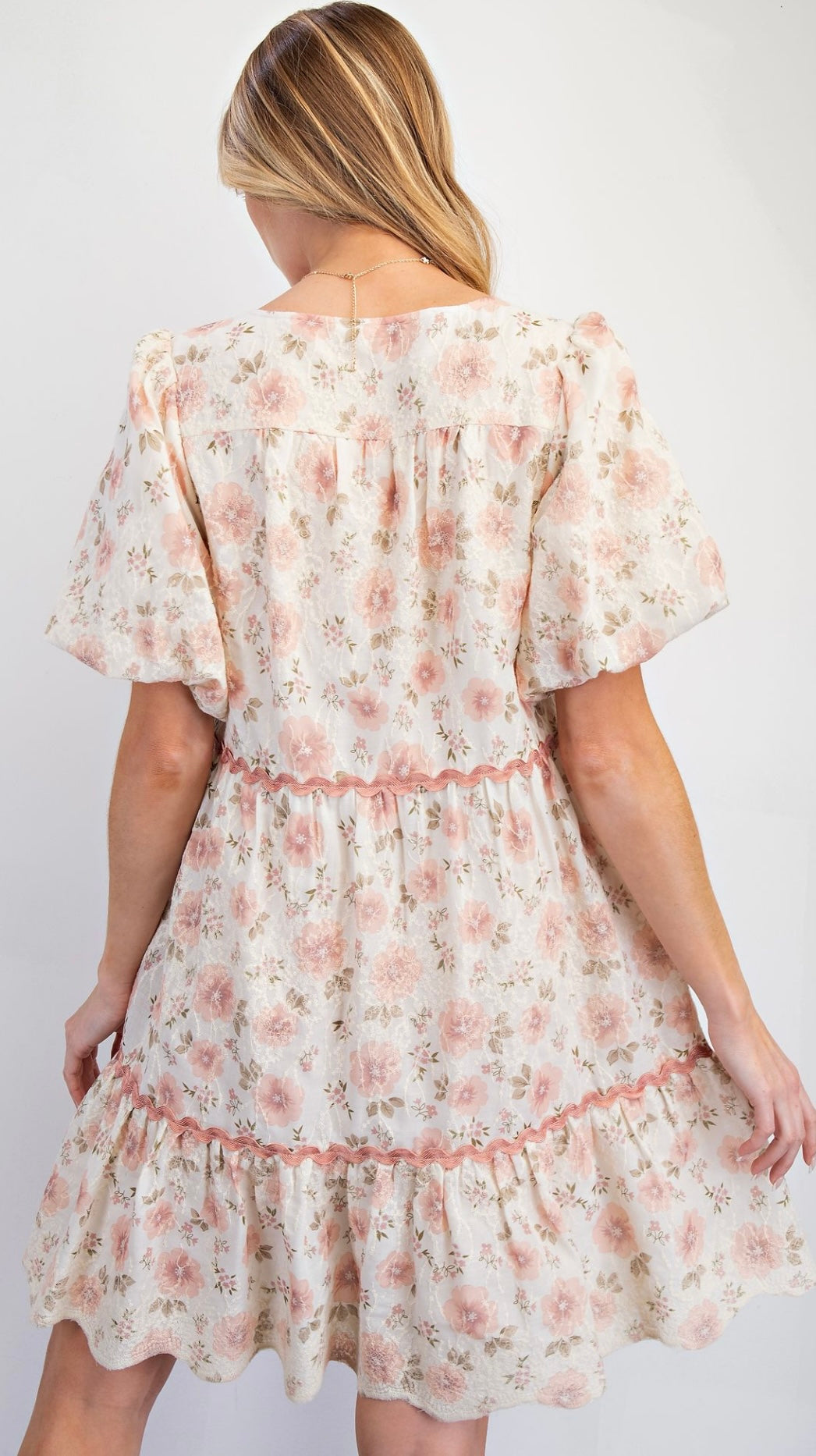 Our Floral Print Woven Dress is perfect for any occasion with its cute puff sleeves and convenient side pockets. The ric rac trim and floral embroidery add charming details, while the ruffled and scalloped bottom adds a feminine touch.