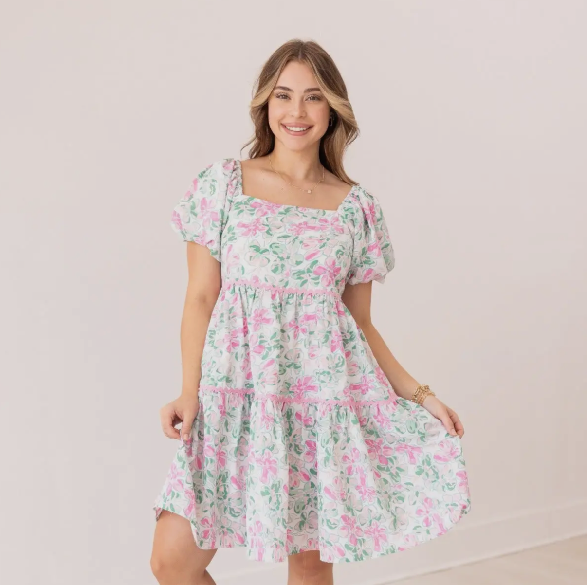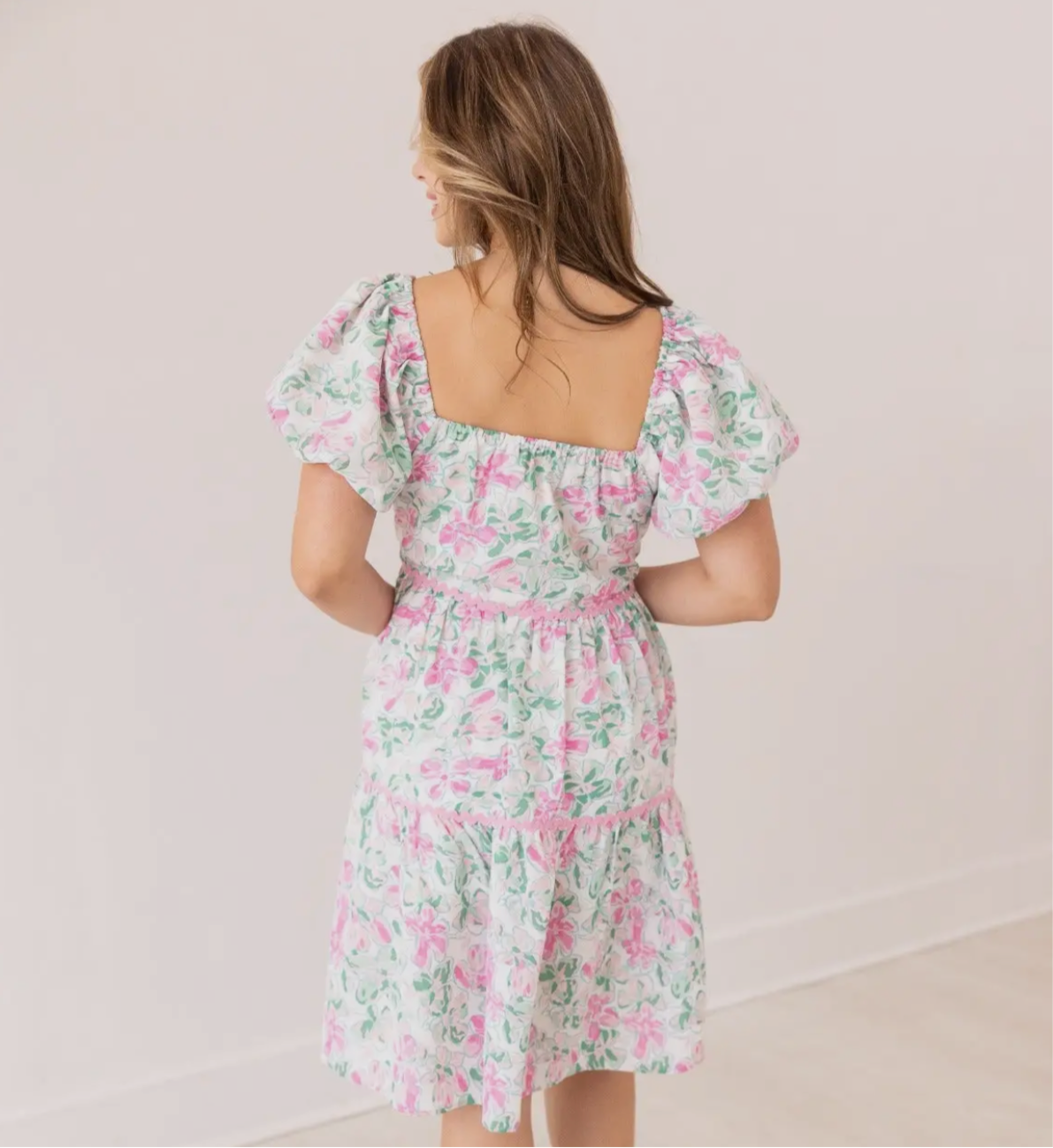 Our Pink Floral Scallop Trim Dress is a beautiful piece. It’s lined for added comfort and structure, with no stretch for a flattering fit. The elastic sleeves and neckline allow you to wear the dress on or off the shoulder, offering multiple styling options.