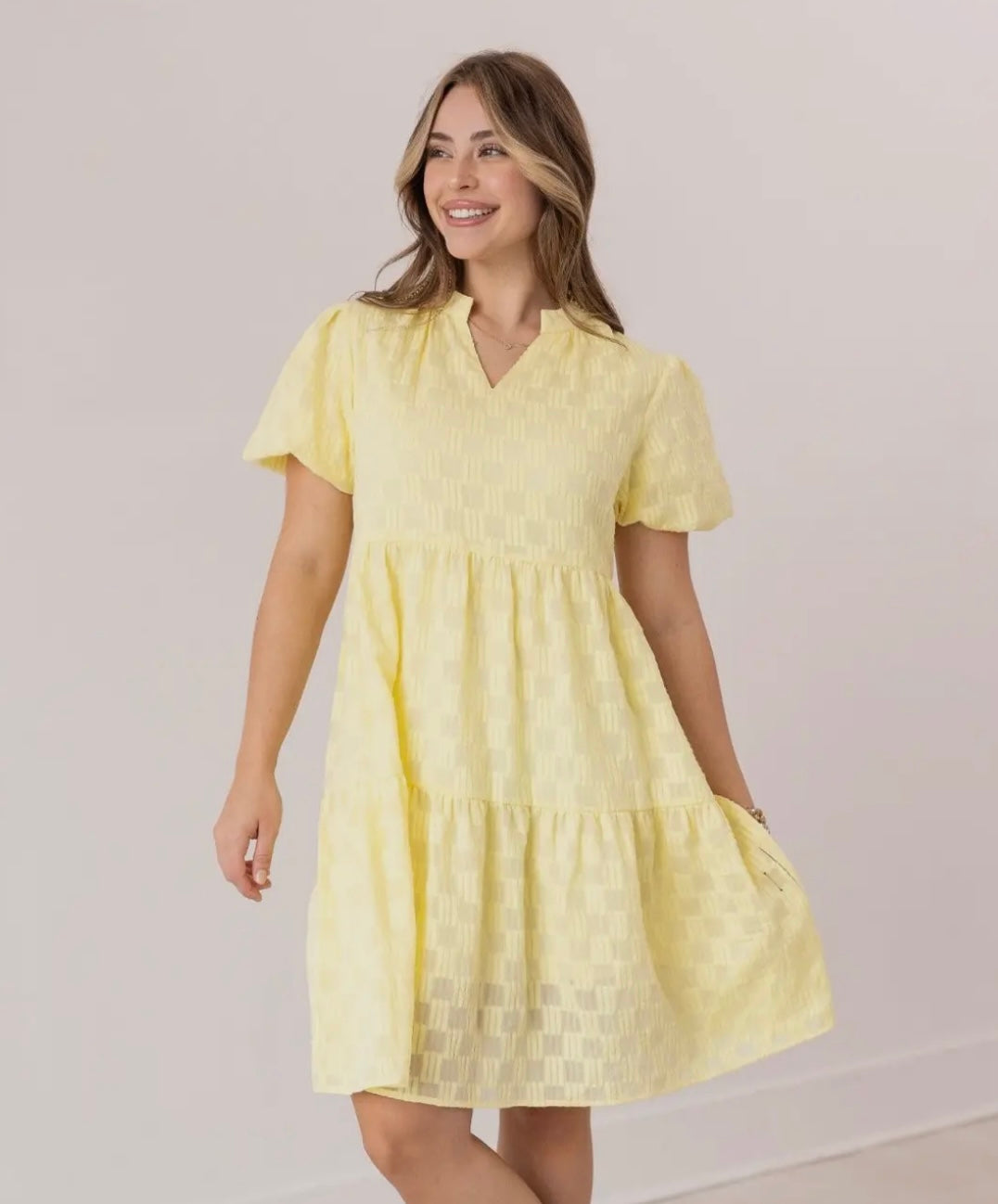 Our V-neck Yellow Checkered Dress features a fresh design, perfect for any occasion. It’s lined for added comfort with no stretch for a tailored fit. The elastic sleeves offer a flattering shape. The V-neck adds elegance and the color is perfect for spring.